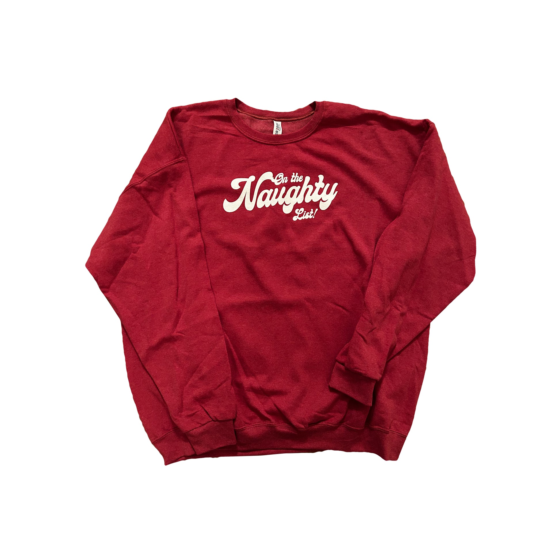 A vibrant red sweatshirt with a playful "On the Naughty List!" design in white font. Comfortable and perfect for the festive season.