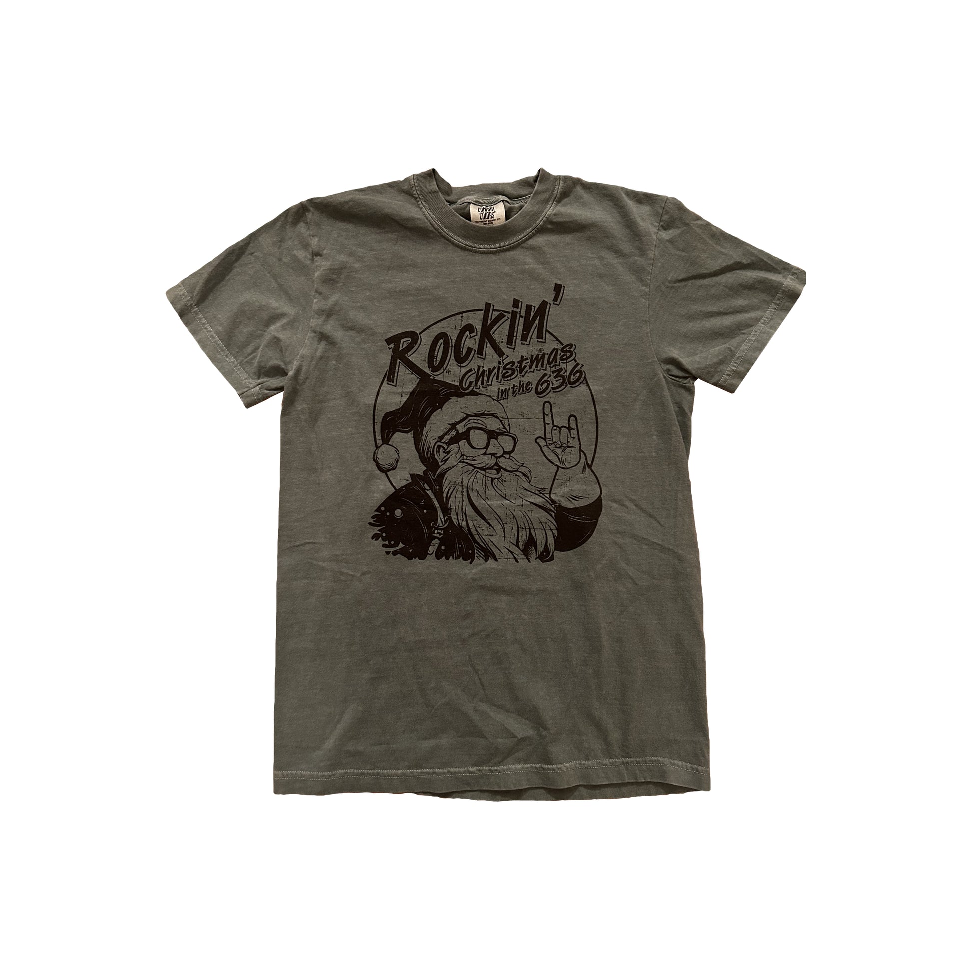 A casual green T-shirt featuring a Santa Claus graphic and the text "Rockin' Christmas in the 636." Great for adding a fun, local holiday touch.